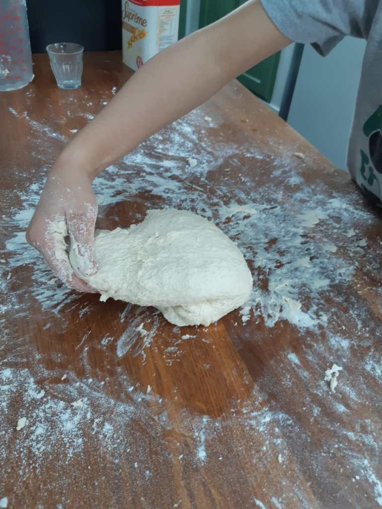 3: La pâte est collante, c’est normal on peut commencer le pétrissage. Prenez un bout de pâte, rabattez-la sur elle-même, tournez d’un quart de tour et recommencez jusqu’à avoir une pâte homogène qui ne colle pas et qui s’étire comme un chewing-gum.